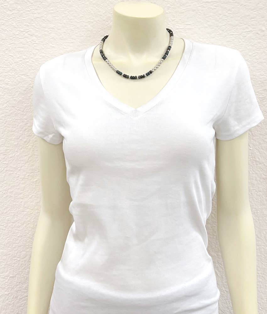 16" to 21" Long, Handmade Unique Deep-dark-tone Gemstone & Silver Navajo Bead Necklace