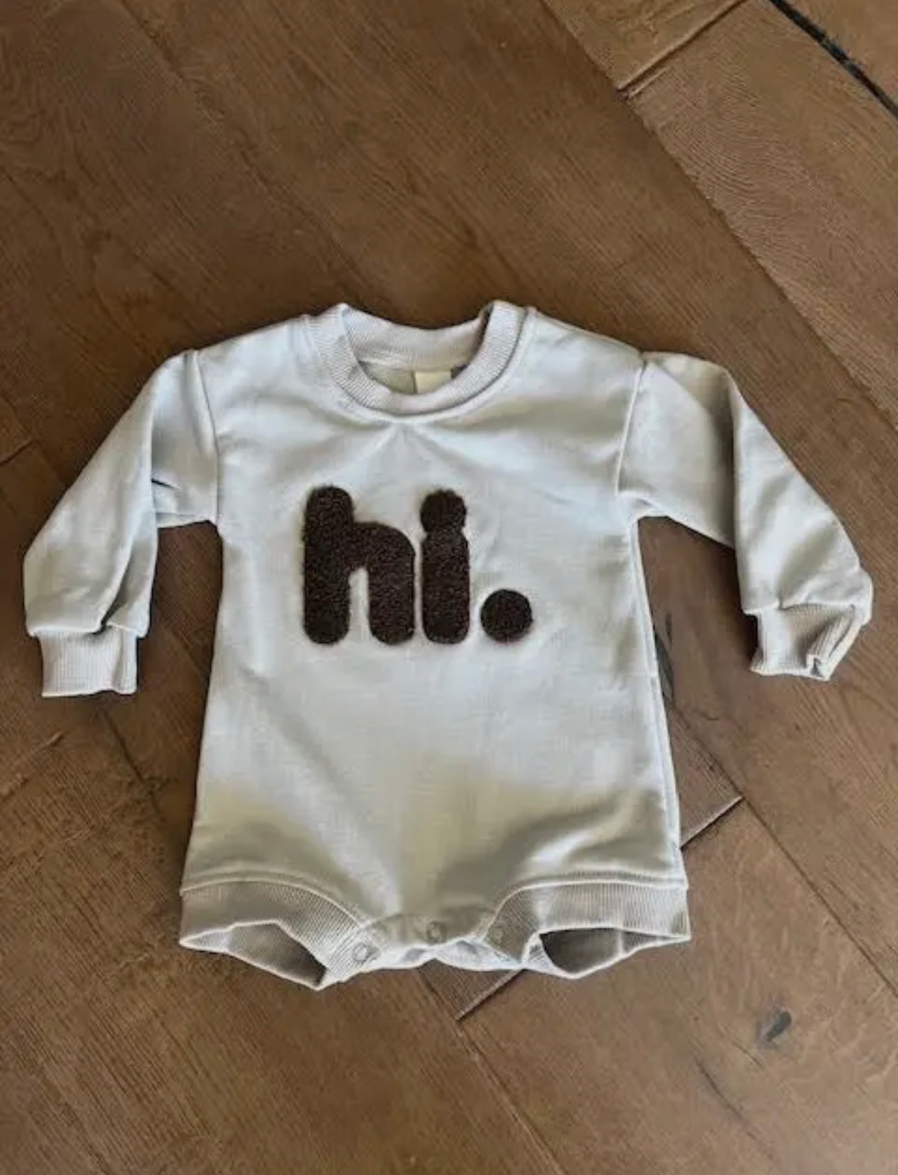 The cutest unisex embroidered HI jumpsuit with snap closure! Khaki in color with dark chocolate brown sherpa embroidery.