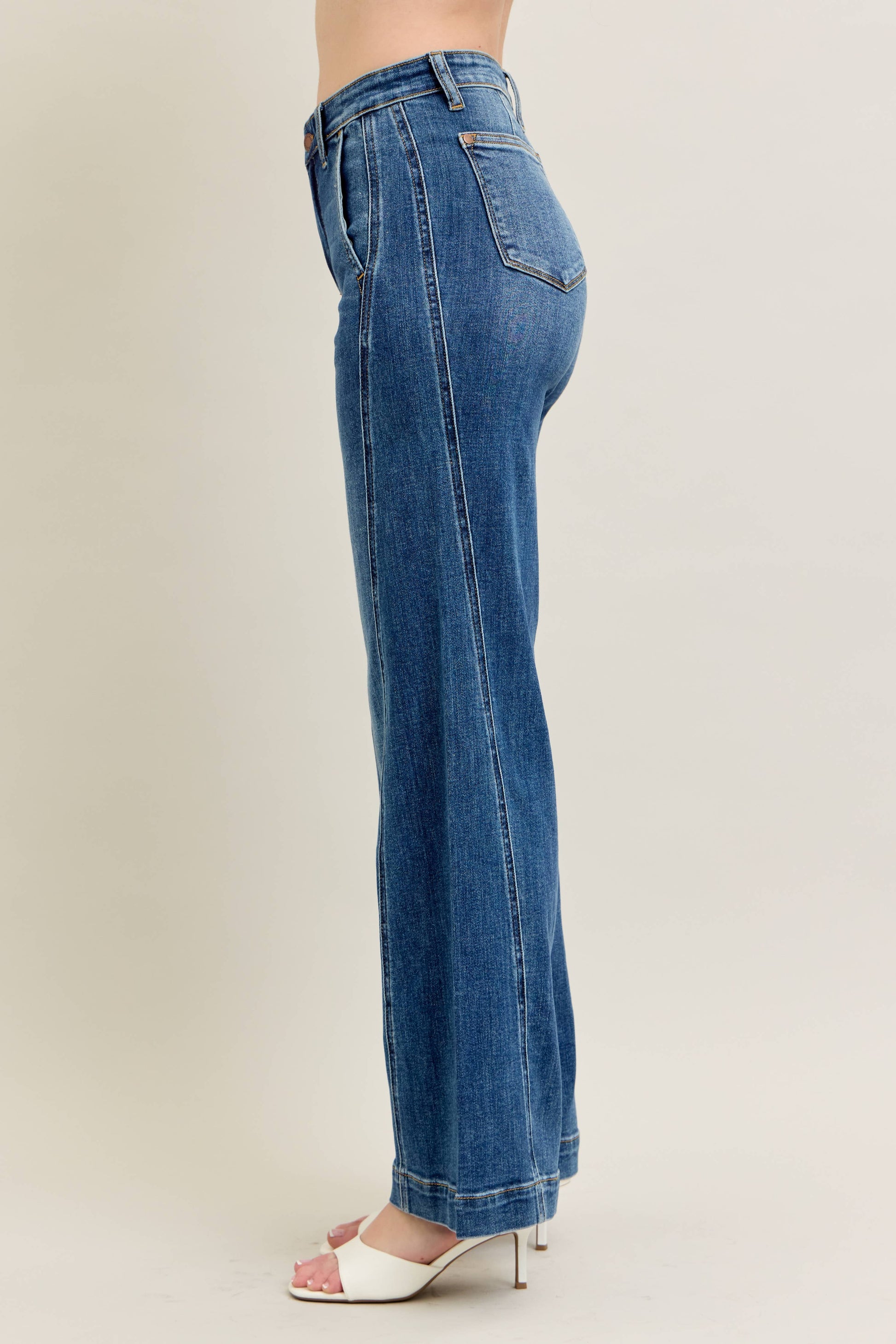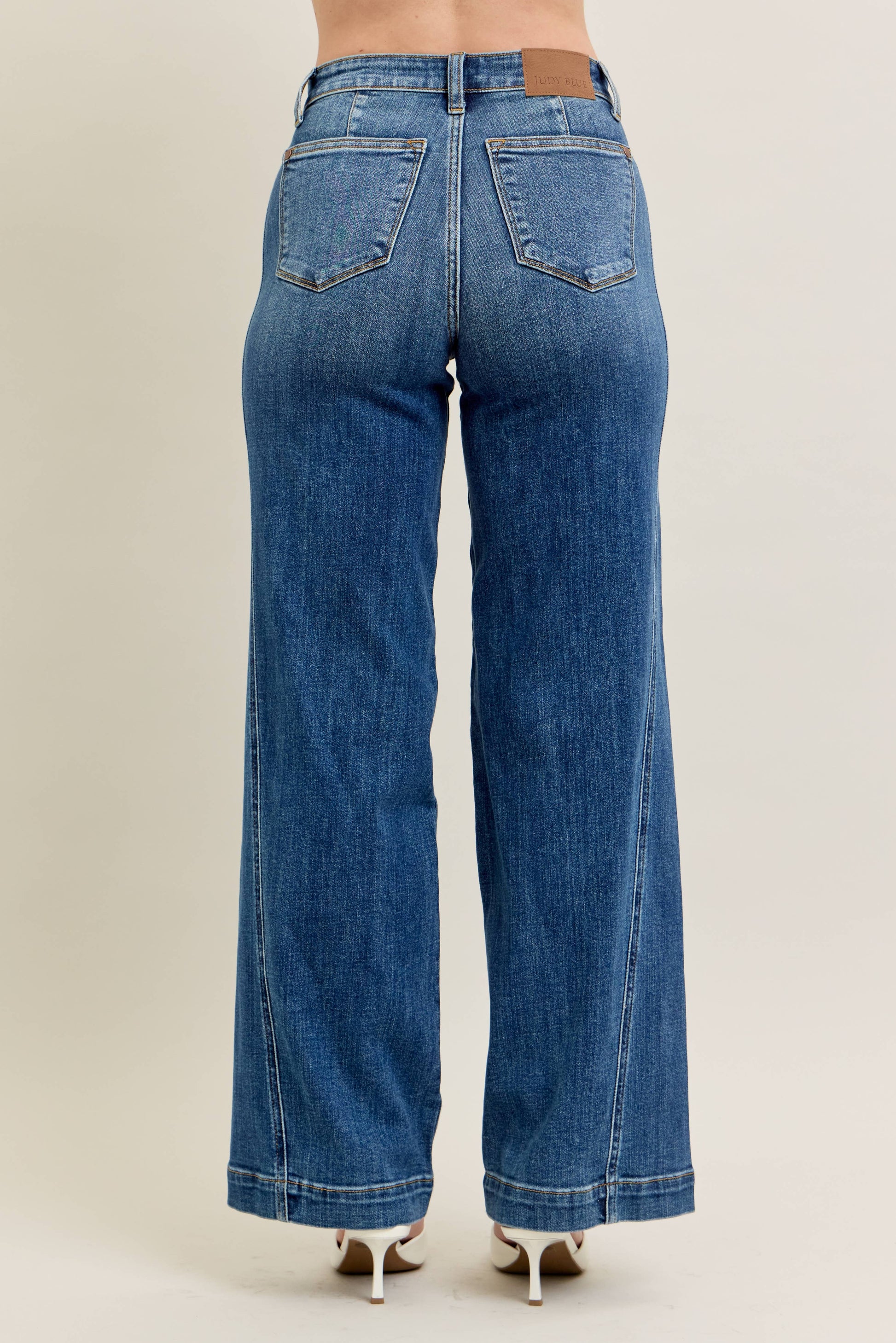 Step into the season with our High Waisted Trouser Wide Leg jeans from Judy Blue. Tailored with a contemporary style, these jeans are perfect for your spring/summer wardrobe. With an English medium wash and a high waist, they offer an effortlessly chic vibe. The wide-leg and ankle-length design make for a trendy silhouette. Crafted from a blend of 93% Cotton, 6% Polyester, and 1% Spandex, these jeans provide the comfort and flexibility you need. They come with a front rise of 10 1/4 and an inseam of 32. Feel the difference of Judy Blue's dedication to quality in every stitch.